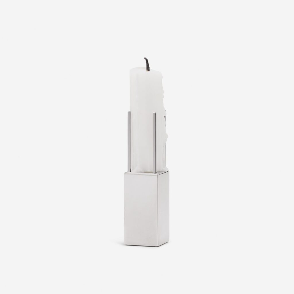 The candlestick stands as a solid, square block from which four slender rods rise, enclosing the candle to hold it in place. The thin rods ensure that the entire candle remains visible, displayed in its full form, just as it is. The shape is inspired by reinforcement bars protruding from a freshly cast concrete slab, capturing the essence of construction.